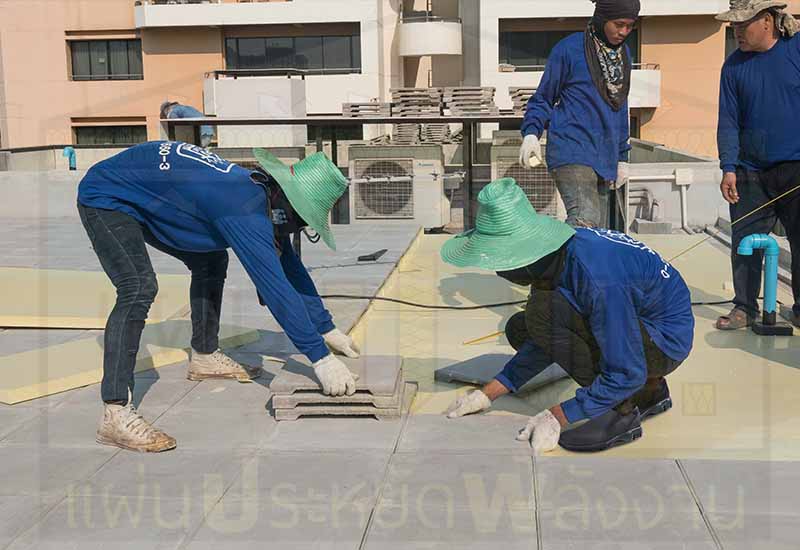 ปูแผ่นโฟมกันความร้อนบนดาดฟ้าคอนกรีตแล้วทับหน้าด้วยโซล่าร์สแลป